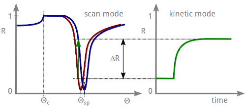 In the so-called “scan mode”, again, angular scans are performed to obtain surface plasmon spectra, from which the optical thickness of the dielectric adlayer can be obtained by model-fit calculations.