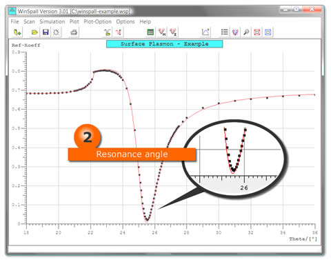 The resonance angle. This is “our plasmon” – the quantity, we want to determine. In the absence of any film, its angular position is given by the optical constants of the prism, the surrounding medium, and the type of metal. Measuring the plasmon of such a “blank substrate” is important to determine exactly these parameters and use them later on for the analysis of the plasmon measured after layer deposition. The modeling of these reflectivity curves is then done using the parameters of the blank fit and adjusting only film related layer parameters.