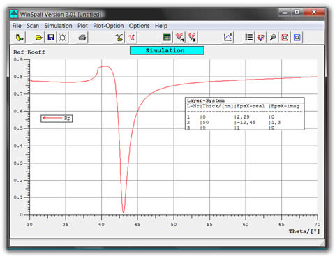 We go back to our simulation table and add an optical component between the glass and the air: a 50 nm thick gold layer with the optical constants “Eps-X real”=-12.45 and “Eps-X imag”=1.3. Those are typical values for gold but can vary to some extent due to slight differences in the evaporation process.