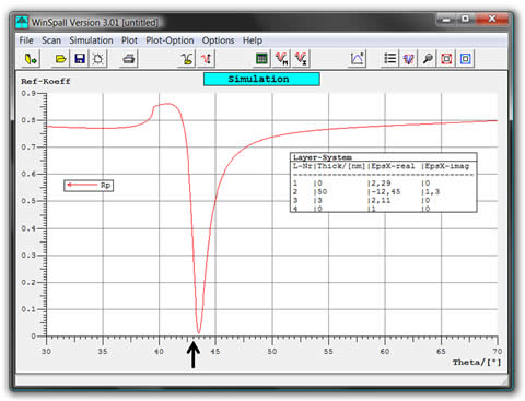 We have now added a 3nm layer on top of the gold with a dielectric constant of e'=2.11 (n=1.45) – maybe some polymer or a protein. The plasmon resonance has shifted a little. The arrow marks the previous minimum. We are now about half a degree higher.