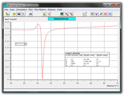 Even thicker: 300 nm and we find something new. A very sharp dip in the reflectivity curve but at a smaller angle. This is not a plasmon, this is a waveguide mode. The first waveguide for this layer system.